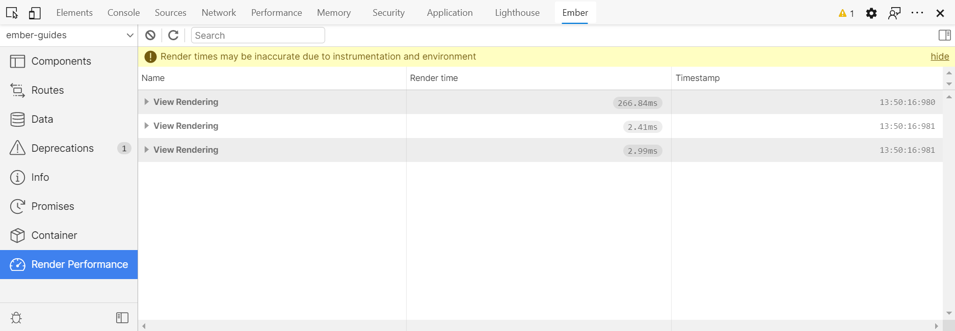 Using the Inspector adds a delay to your rendering, so the durations you see are not an accurate representation of the speed of your production apps. Use these times to compare durations and debug rendering bottlenecks, but not as a way to accurately measure rendering times.